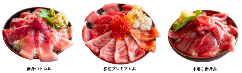 「松前プレミアム丼」・「赤身中トロ丼」・「中落ち赤身丼」を提供させていただきます。